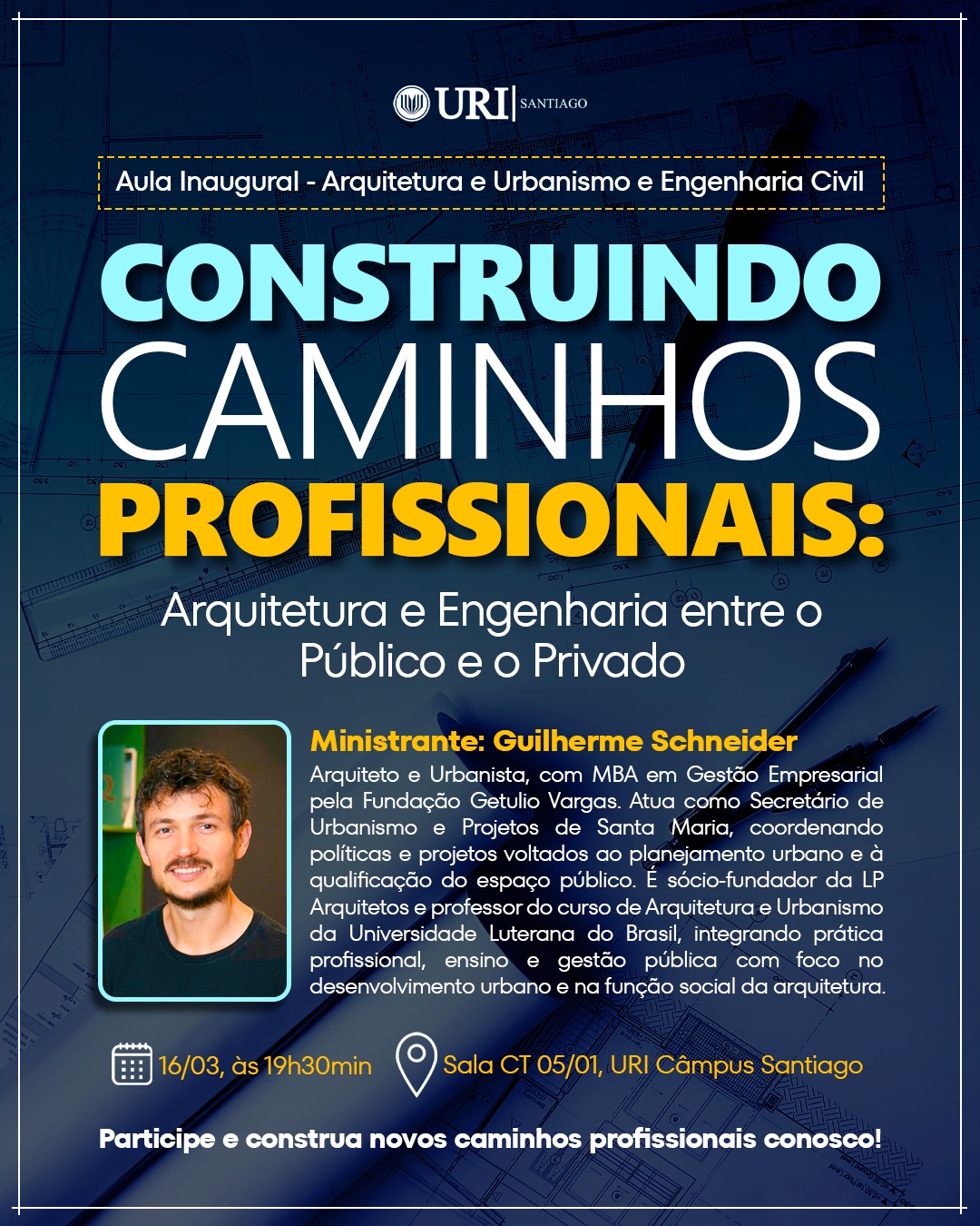 TÍTULO DA PALESTRA: "Construindo Caminhos Profissionais: Arquitetura e Engenharia entre o Público e o Privado"PALESTRANTE: Guilherme Sch...